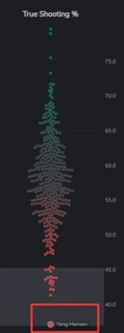 杨瀚森本赛季真实投篮命中率是全联盟最低档(39.5%,虽然样本较小,总排名474位,球员总数约为498),低于克里斯·保罗(同样样本较小)和布朗尼。